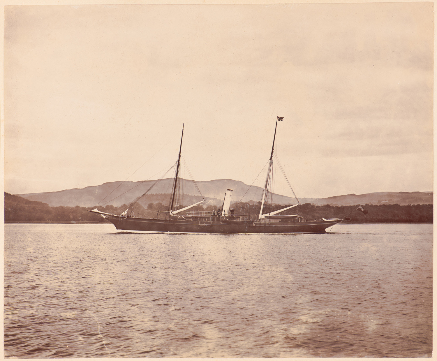 Nazwa: Brytyjski jacht parowy płynie ożaglowaniem gaflowym wzdłuż wybrzeża., data: 1880 - 1900, miejsce: , typ obiektu: , wymiary23 x 27,8, opis: Akwen wodny; dwumasztowy szkuner parowy; ma zwinięte żagle; ciemny kadłub; widziany od lewej burty; na banderze flaga Wielkiej Brytanii;