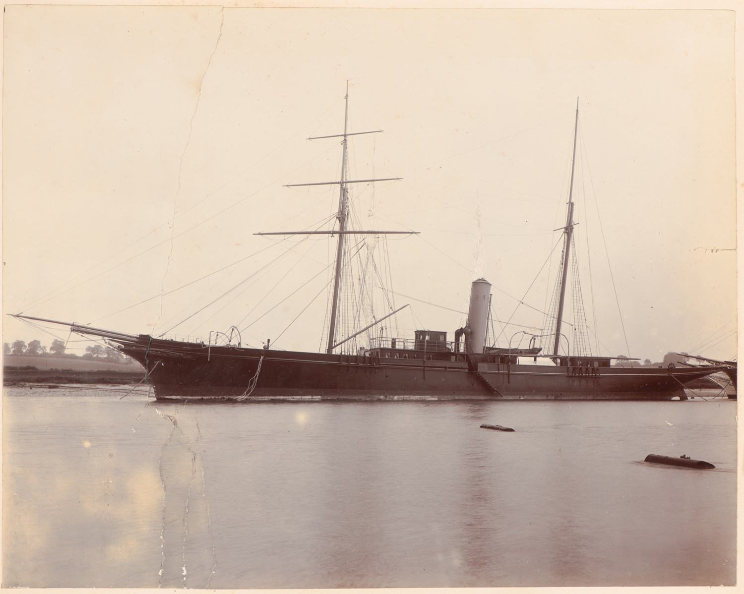 przy bojach cumowniczych., data: l. 90. XIX w., miejsce: , typ obiektu: , wymiary23,4 x 29,7, opis: Brygantyna parowa zacumowana do brzegu prawą burtą, ale w dużym oddaleniu; na pierwszym planie bardzo spokojna woda i dwa fragmenty betonu (?)