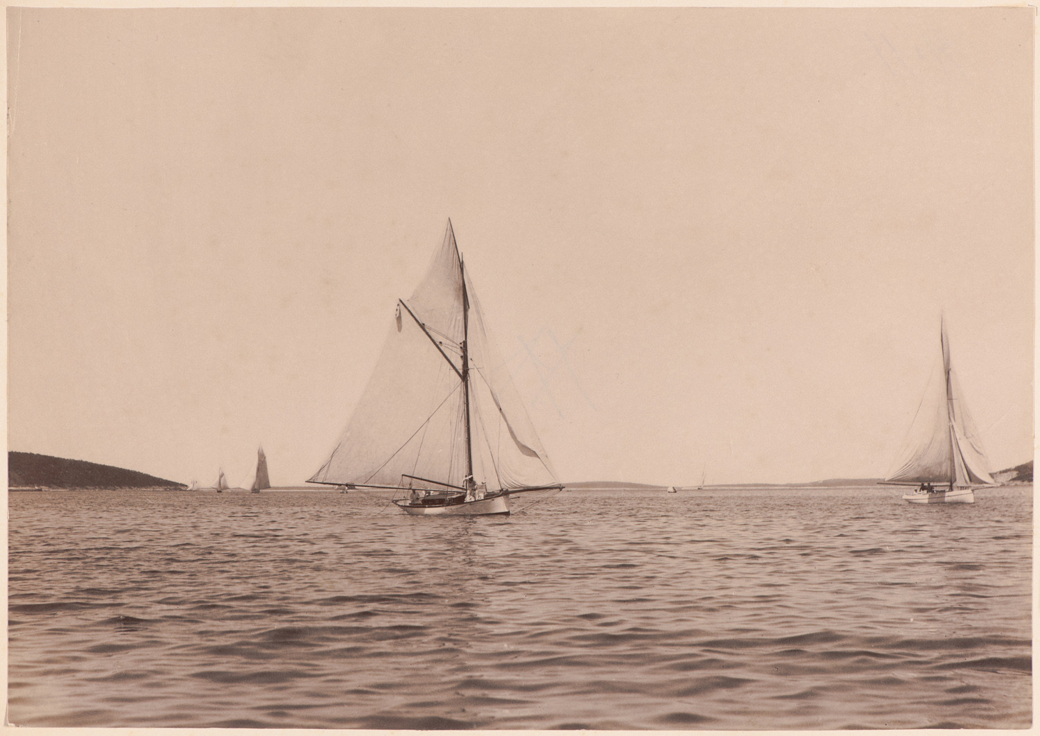 Niewielkie jachty w regatach wśród archipelagu chorwackiego, w oddali boja cumownicza