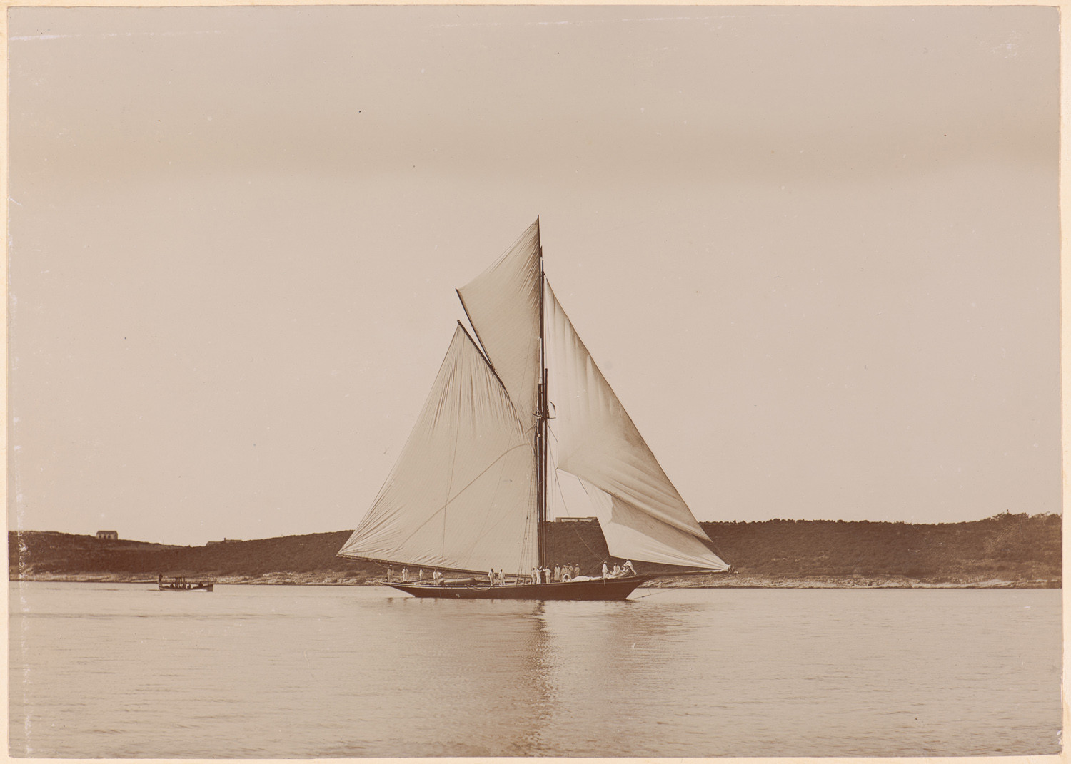 w tle wybrzeże półwyspu Istria, data: l. 90. XIX w., miejsce: , typ obiektu: , wymiary18,9 x 26,6, opis: Akwen wodny, na pierwszym planie spokojna woda, na środku kuter gaflowy Christa ( jacht wyścigowy) z załogą