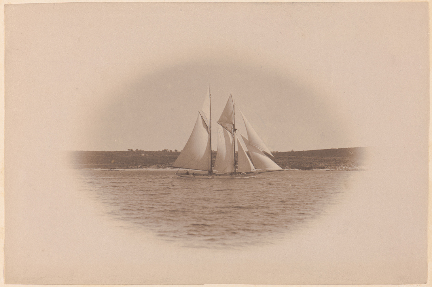 u wybrzeża chorwackiego, data: prawdopodobnie 1892, miejsce: , typ obiektu: , wymiary12,6 x 19, opis: Akwen wodny; na pierwszym planie dwu masztowy szkuner gaflowy, widziany od prawej burty, płynie na rozłożonych żaglach; kadłub ma jasny;