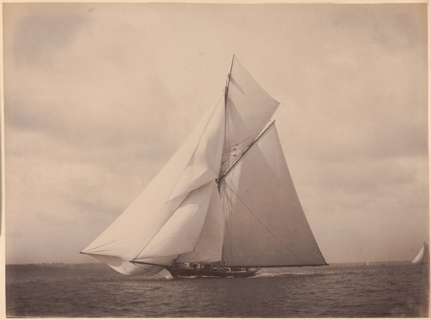 dodatkowego bomu, data: 1880 - 1897, miejsce: , typ obiektu: , wymiary21,4 x 29, opis: Akwen wodny, na pierwszym planie kuter gaflowy widziany od dziobu i lewej burty; ma rozwinięty takielunek; bomy wysunięte poza obie burty;