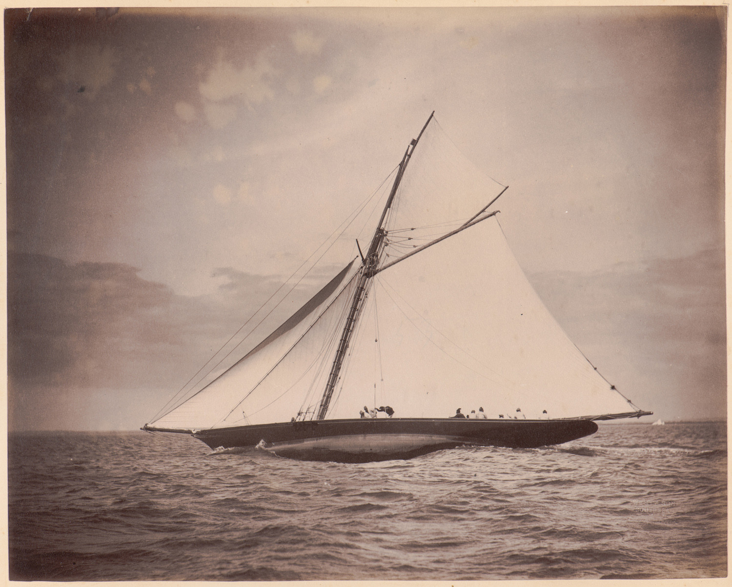 Nazwa: Thalia w szkwale, data: 1891 - 1897, miejsce: , typ obiektu: , wymiary22,7 x 28,5, opis: Akwen wodny; na pierwszym planie kuter gaflowy Thalia widzianya z lewej burty; ma rozwinięte cztery żagle; jest mocno przechylona na prawą burtę