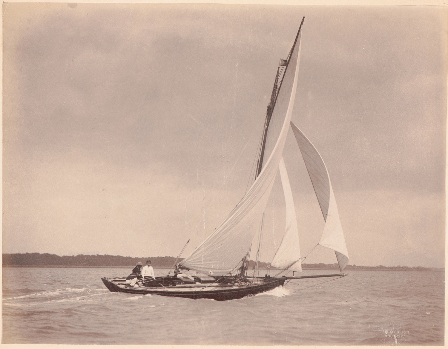 przy silnym wietrze, data: 1890 - 1897, miejsce: , typ obiektu: , wymiary22,2 x 28,7, opis: Akwen wodny; na pierwszym planie niewielki kuter gaflowy Alwida widziana od prawej burty; bom wychylony poza prawą burtę; rozwinięty częściowo takielunek;