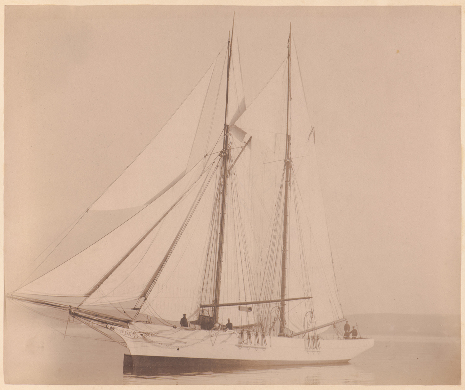 na spokojnej wodzie, data: l. 90. XIX w., miejsce: , typ obiektu: , wymiary26 x 31,3, opis: Akwen wodny; na spokojnej wodzie na pierwszym planie dwumasztowy szkuner gaflowy Senj, widziany od dzioba i lewej burty, kadłub statku jasny, ciemne dno;