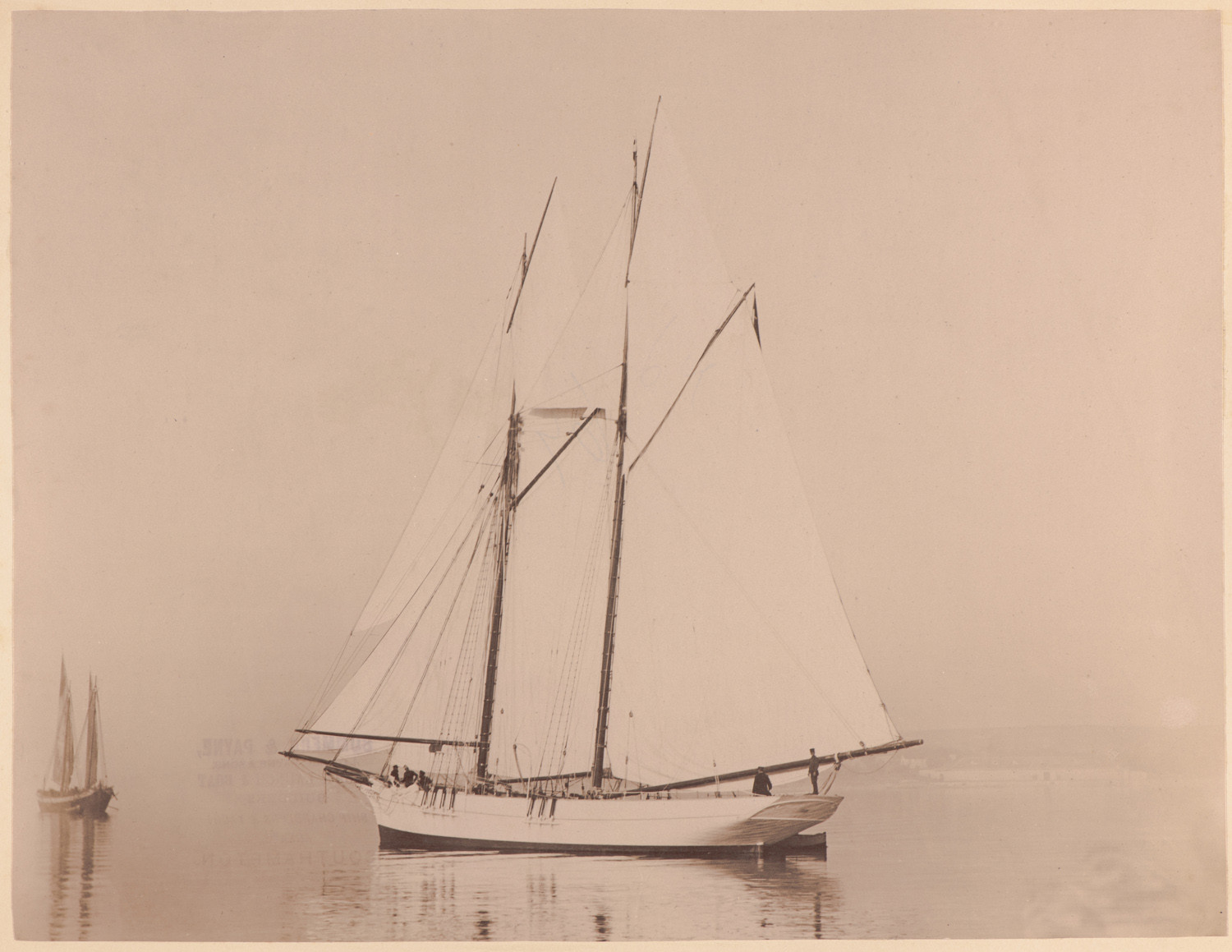 na spokojnej wodzie, data: l. 90. XIX w., miejsce: , typ obiektu: , wymiary23,5 x 30,8, opis: Akwen wodny; spokojna woda; na pierwszym planie dwumasztowy szkuner Senj, widziany od rufy i lewej burt; na dziobie stoi trzech mężczyzn w ciemnych strojach; na rufie stoi
