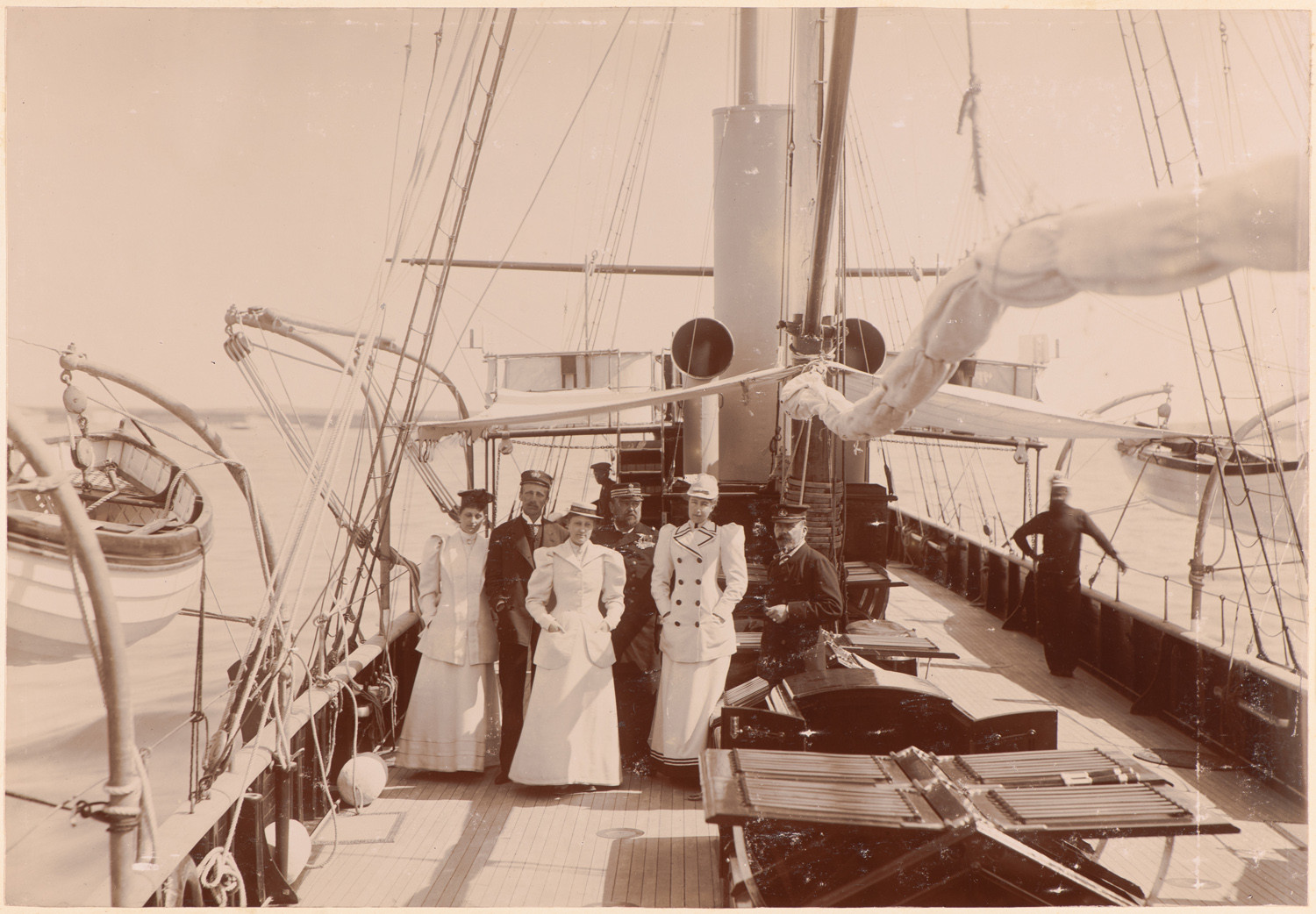 Nazwa: Maria Teresa i Karol StefanHabsburg, Klotylda Luiza Koburg, jacht "Christa", data: 1894, miejsce: , typ obiektu: , wymiary21,6 x 31,4, opis: Portret grupowy na pokładzie żaglowca parowego, sześcioosobowa grupa stoi przed kominem a za zejściówką: trzech mężczyzn w ciemnych mundurach w czapkach z emblematami marynistycznymi; trzy panie w jasnych sukniach i płaszczach; za grupą nieco dalej