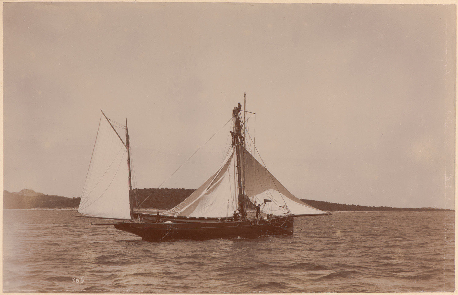 austro-węgierskie wokół Puli, data: l. 90. XIX w., miejsce: , typ obiektu: , wymiary18,7 x 29,3, opis: Akwen wodny; na pierwszym planie jol gaflowy Erycina widziany od rufy i prawej burty; ma rozwinięte część żagli; ma złamany maszt przedni;