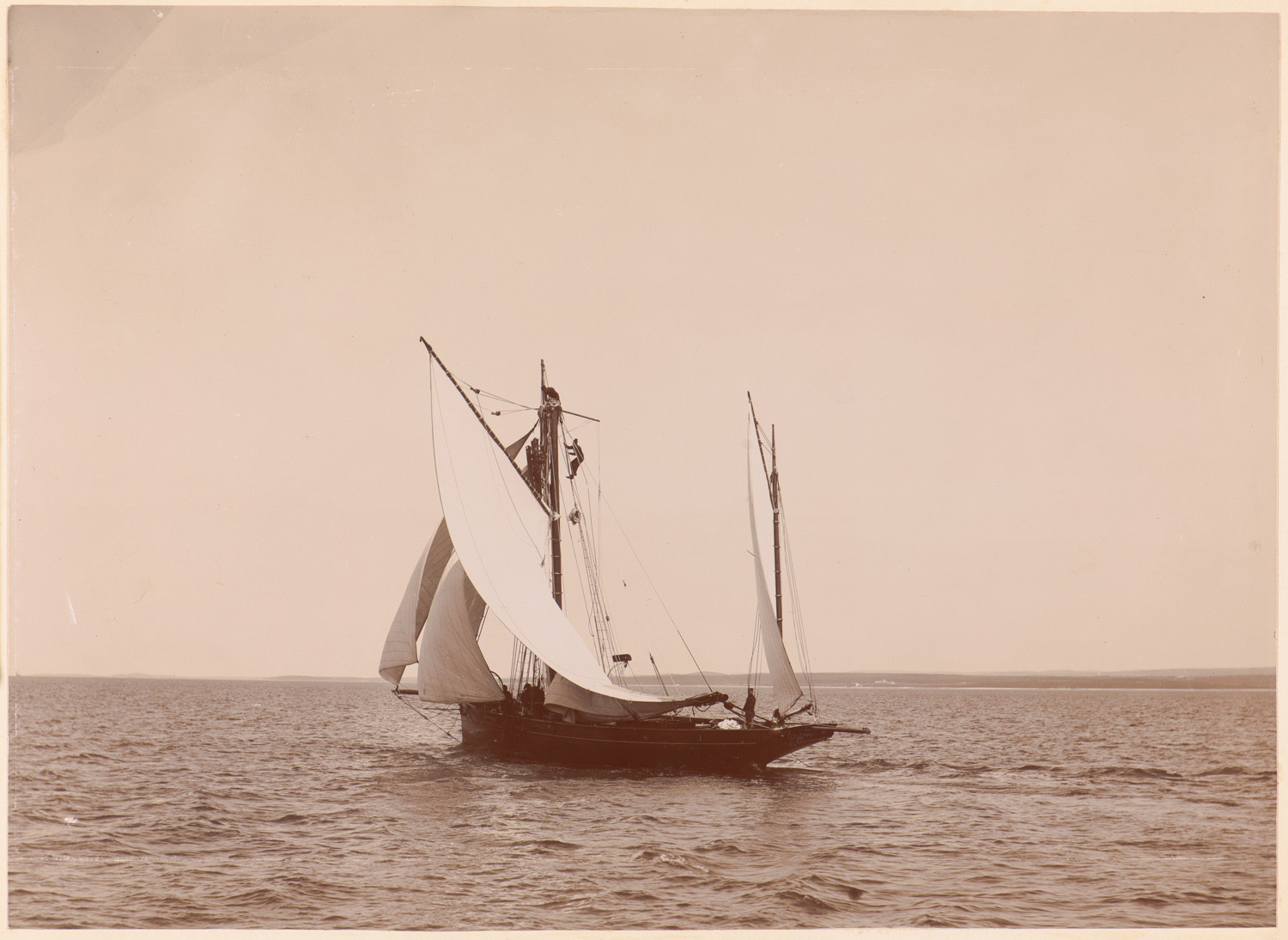 złamanego masztu, data: l. 90. XIX w., miejsce: , typ obiektu: , wymiary21,7 x 30,2, opis: Akwen wodny; na pierwszym planie jol gaflowy Erycina widziany od rufy i lewej burty; jacht ma złamany pierwszy maszt; ma rozwiniętą część żagli;
