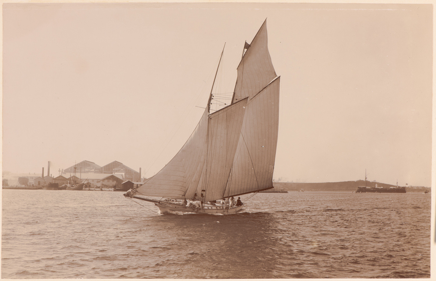 przez port w Puli, data: l. 90. XIX w., miejsce: , typ obiektu: , wymiary18,8 x 29,3, opis: Port; na pierwszym planie dwumasztowy szkuner gaflowy widziany od dziobu i lewej burty; żaglowiec o jasnym kadłubie i dekoracyjnej wici na dziobie; na