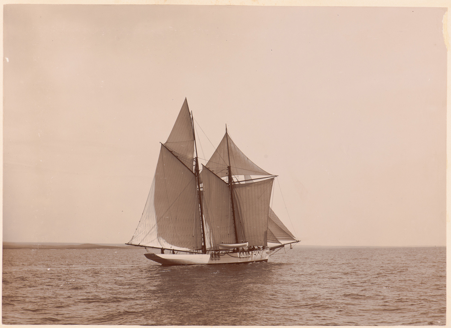 przy lekkim wietrze., data: lata 90. XIX w., miejsce: , typ obiektu: , wymiary22 x 30,7, opis: Akwen wodny; na pierwszym planie Senj dwumasztowy szkuner gaflowy widziany od rufy i prawej burty; w pełnym takielunku; na topie drugiego masztu powiewa chorągiewka