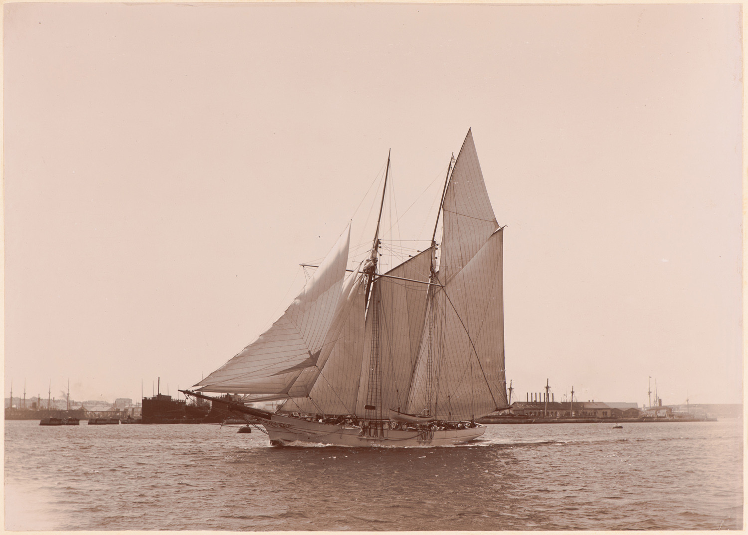 Nazwa: Senj płynie przez port w Puli., data: lata 90. XIX w., miejsce: , typ obiektu: , wymiary22,2 x 30,8, opis: Port; na pierwszym planie Senj, szkuner gaflowy widziany od dziobu i lewej burty; z rozwiniętymi prawie wszystkimi żaglami; na topie drugiego masztu powiewa jasna