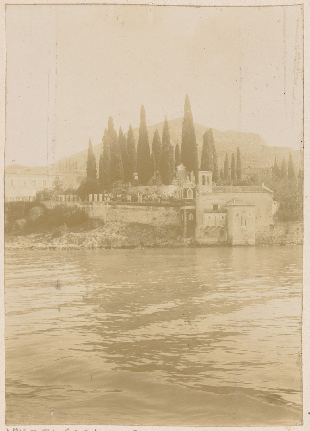 Nazwa: Jezioro Garda, data: 1900-1901, miejsce: , typ obiektu: , wymiary8,5 x 6,1, opis: fotografia pamiątkowa; forteca z elementami średniowiecznymi, nowożytnymi; cyprysy;