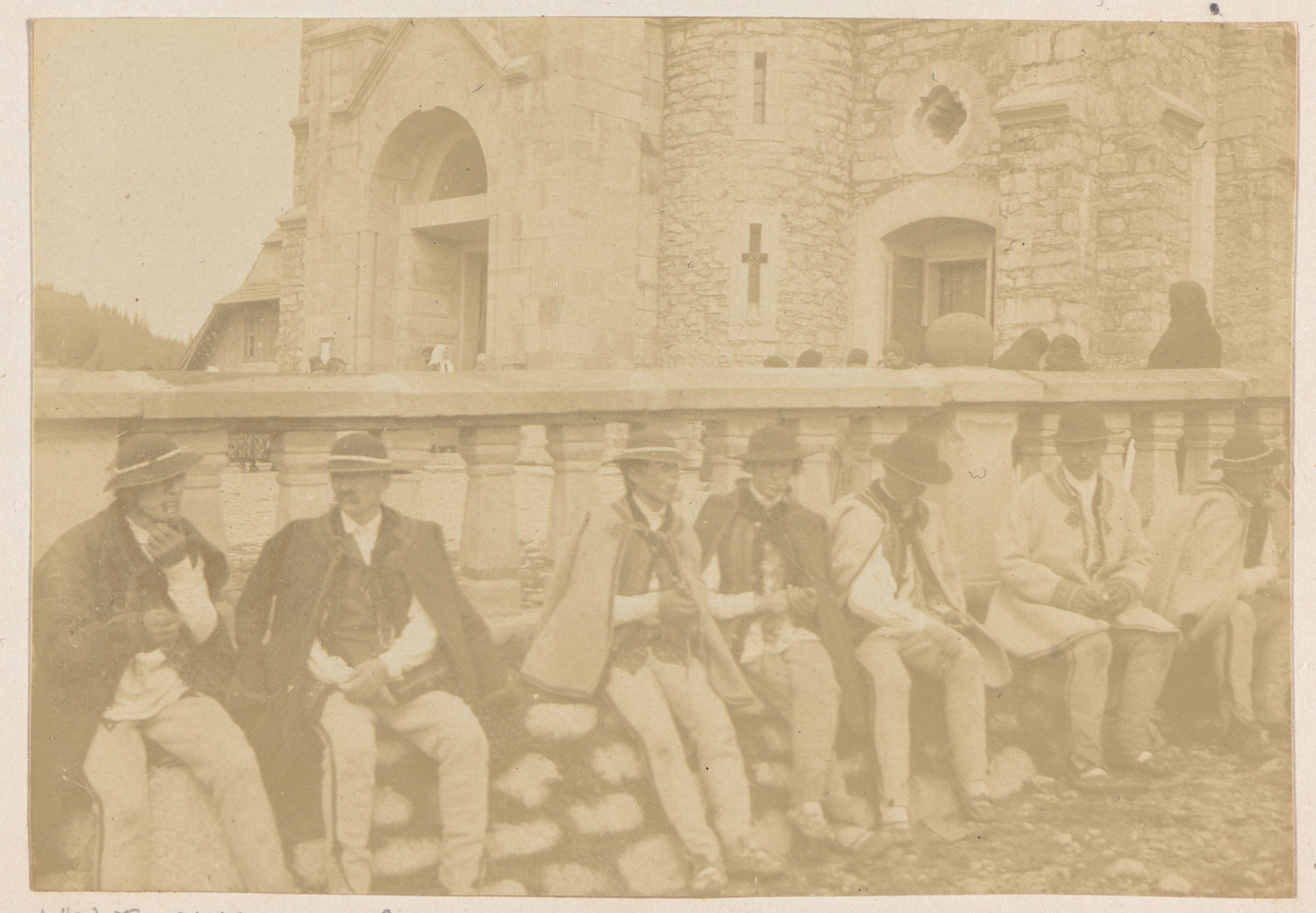 Nazwa: Zakopane, Górale przed kościołem, data: 1900-1901, miejsce: , typ obiektu: , wymiary6,1 x 8,8, opis: mężczyźni w odświętnych strojach; kościół kamienny neoromański