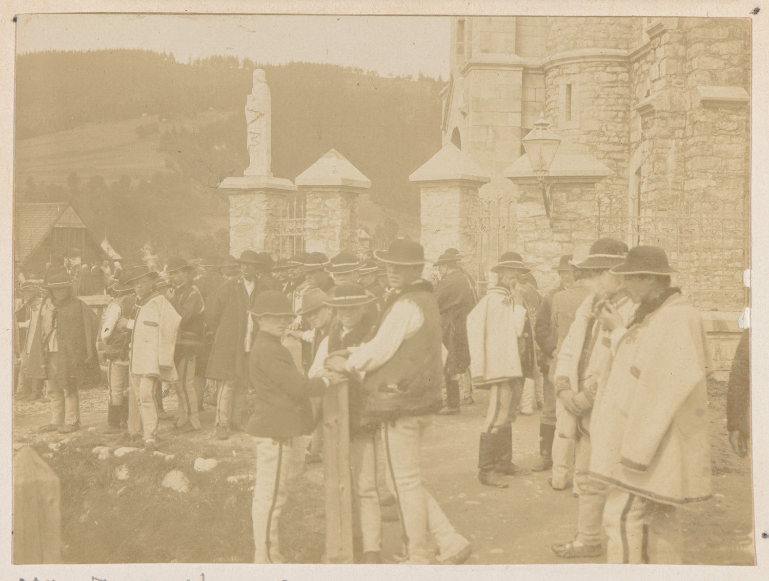 Fotografia przedstawia dużą grupę górali stojących pod nowym kościołem parafialnym przy Krupówkach (pod wezwaniem św. Rodziny). Jest rok 1901. Fotografia daje wyobrażenie stroju i obyczajów górali, przedstawia też fragmentaryczny widok nowego w tamtych czasach kościoła. Stanowi przykład dobrej fotografii amatorskiej w technice czarno-białej, tonowanej, z albumu krakowskiej rodziny Pusłowskich. Muzeum Fotografii w Krakowie posiada trzy takie albumy. Autorem fotografii mógł być Ksawery Pusłowski. Fotografie w albumach przedstawiają Tatry, Zakopane, Pieniny, wieś Frydman, wybrzeże Morza Śródziemnego, Bretanię, Kraków i inne widoki. Kilka fotografii przedstawia też chłopów podkrakowskich na targu na placu Szczepańskim w Krakowie. Mężczyźni są w odświętnych strojach, stoją pod kościołem murowanym, z kamienia, po lewej figura św. Józefa, w głębi stok Gubałówki. Na I planie po prawej góral zwrócony w lewo, ubrany w portki, cuchę, pośrodku trójka chłopców w portkach, białych koszulach i serdakach, wszyscy w kapeluszach góralskich. Chłopcy góralscy stanowią barthesowskie punctum na tej fotografii, detal przyciągający uwagę widza. Interesujących detali jest więcej – kolejny góral po prawej, kamienie w konstrukcji kościoła, rzeźba św. Józefa na cokole. Ks. Józef Stolarczyk położył kamienne fundamenty pod nowy kościół w 1877 roku. Wznoszono go powoli rękami górali z górskiego kamienia w latach 1879 -1896, dzięki ofiarności parafian i właściciela dóbr zakopiańskich hrabiego Władysława Zamoyskiego. Budową kierował architekt Józef Dziekoński. Po śmierci księdza Józefa Stolarczyka ( 6 VII 1893 r.) drugim proboszczem Zakopanego był ksiądz Kazimierz Kaszelewski. Nowy proboszcz dokończył budowy kościoła i ołtarzy, zbudował nową plebanię, założył nowy cmentarz parafialny i założył krzyż na Giewoncie ( 19 VIII 1901 roku). Nowy kościół parafialny pod wezwaniem Świętej Rodziny został konsekrowany 16 IX 1899 r. przez ks. biskupa krakowskiego Jana Puzynę. Może jest to moment wyniesienia krzyża na Giewont? Wskazywałaby na to duża grupa mężczyzn; ujęcie wykonane latem: w tle rozpościera się porośnięta trawą hala, na I planie jest widoczna gęsta trawa. Krzyż na Giewoncie zainstalowano w sierpniu 1901 roku, poświęcony był w tym kościele. W Zakopanem w okolicach Krupówek (poczta, Dom Turysty, Muzeum Tatrzańskie) , a także w Tatrach (schroniska) powstawały w tym czasie kamienne budowle, obok tradycyjnej drewnianej zabudowy, która dziś jest szczególnie ceniona. Zwraca uwagę całkowity brak kobiet, góralek, jest jedynie grupa mężczyzn, którzy tradycyjnie zbierają się pod kościołem. Może to tylko niedzielny zwyczaj?