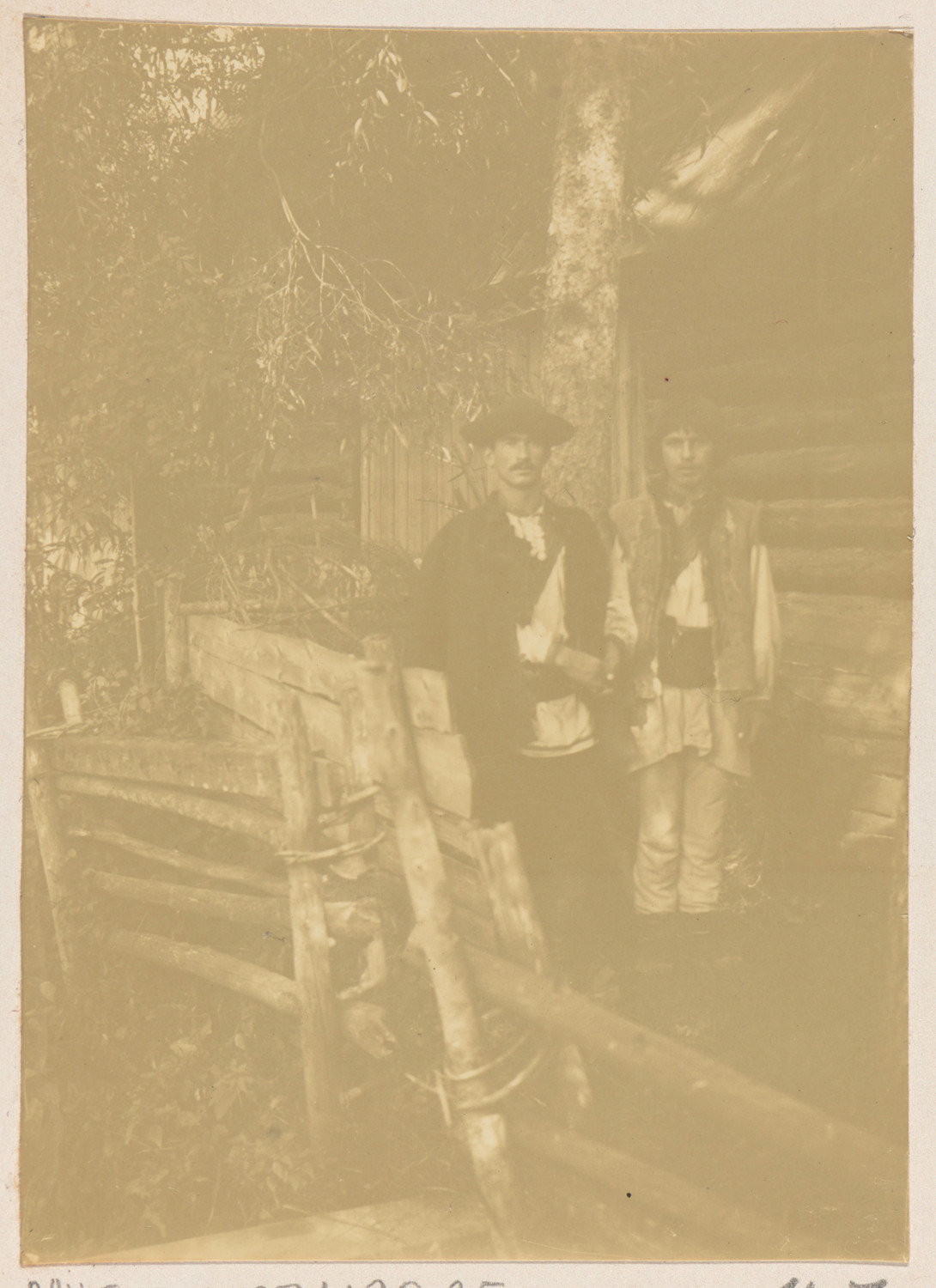 Nazwa: Zakopane, górale z regionu Liptowa (?), data: 1900-1901, miejsce: , typ obiektu: , wymiary8,5 x 6,1, opis: fotografia pamiątkowa; fragment zagrody