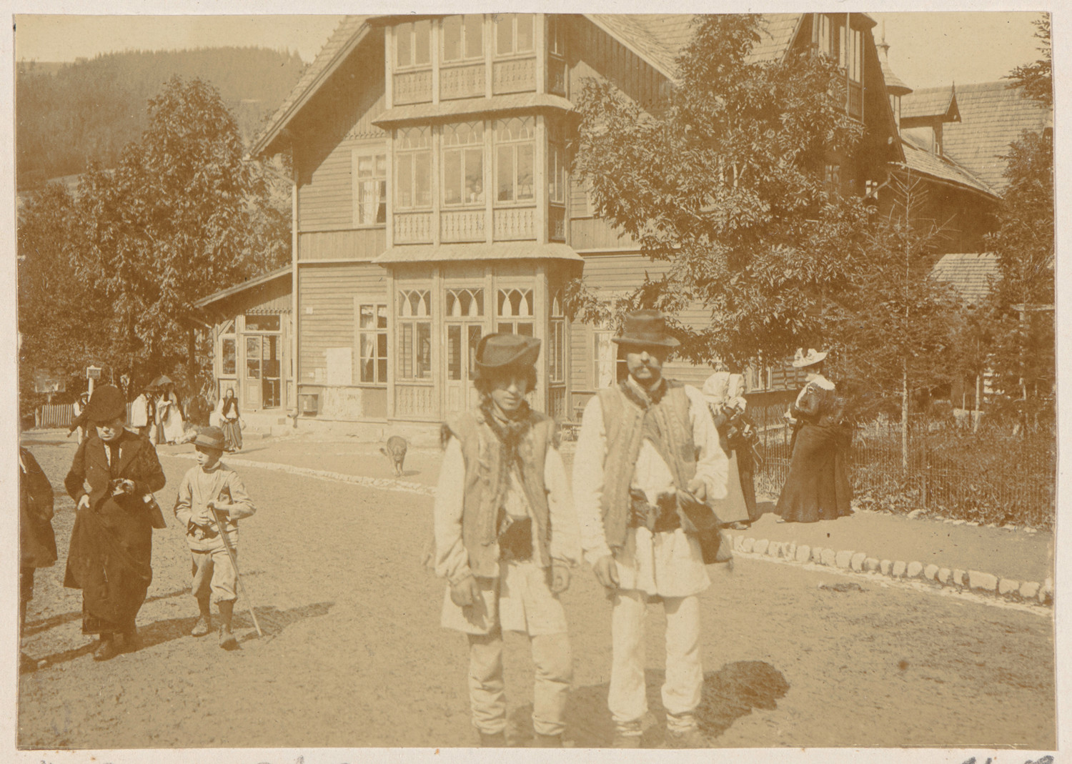 Nazwa: Zakopane, droga do Kuźnic, data: 1900-1901, miejsce: , typ obiektu: , wymiary6,0 x 8,5, opis: ob.ul.Zamoyskiego; pensjonat; Górale Liptowscy (?); przechodnie; fotografia pamiątkowa