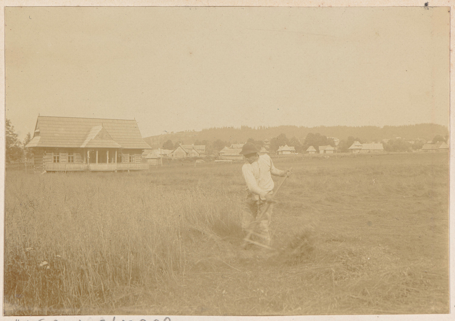 Nazwa: Zakopane, łąki pod reglami, data: 1900-1901, miejsce: , typ obiektu: , wymiary6,0 x 8,7, opis: rejon ul. Kasprusie; pejzaż; kośba; chałupa