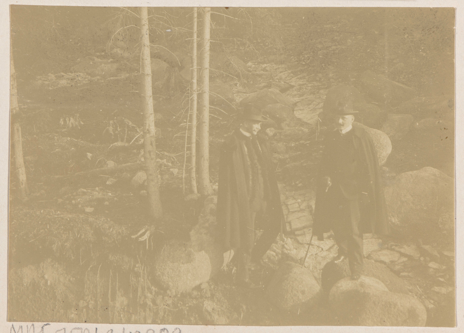 Nazwa: Tatry, dwaj mężczyźni na spacerze, data: 1900-1901, miejsce: , typ obiektu: , wymiary6,1 x 8,6, opis: fotografia pamiątkowa; las świerkowy; głazy