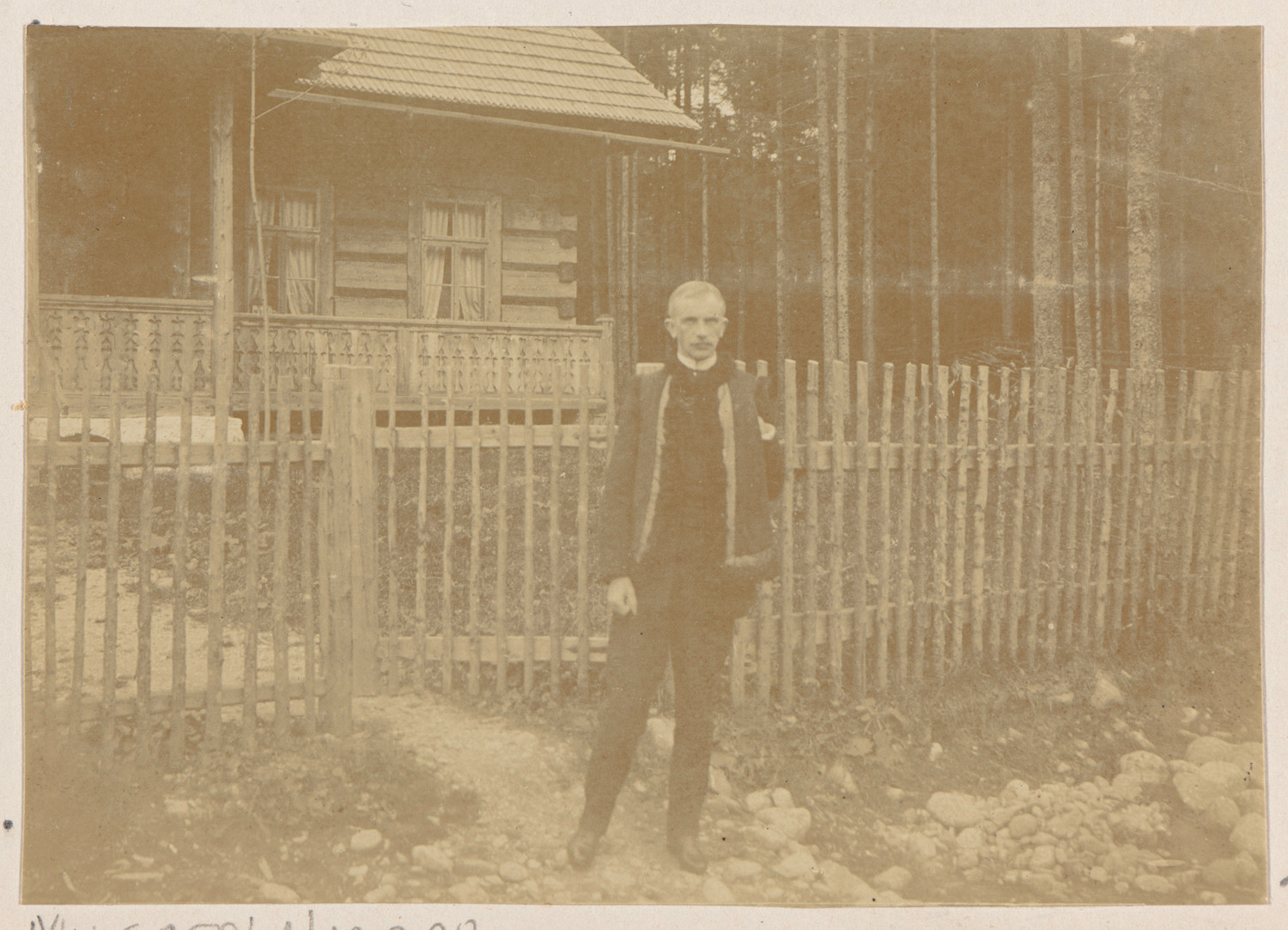 Nazwa: mężczyzna przed zagrodą, data: 1900-1901, miejsce: , typ obiektu: , wymiary6,1 x 8,6, opis: fotografia pamiątkowa; chałupa podhalańska; ogrodzenie; las