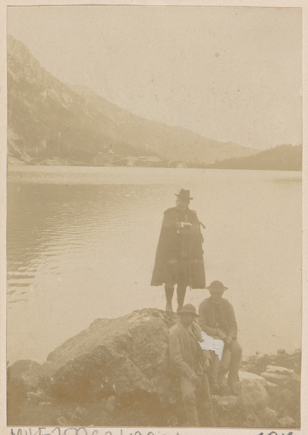 Nazwa: Tatry, Morskie Oko, data: 1900-1901, miejsce: , typ obiektu: , wymiary8,6 x 6,0, opis: pejzaż; fotografia pamiątkowa z wycieczki; mężczyzna z kręgu rodziny Pusłowskich; Górale zakopiańscy;
