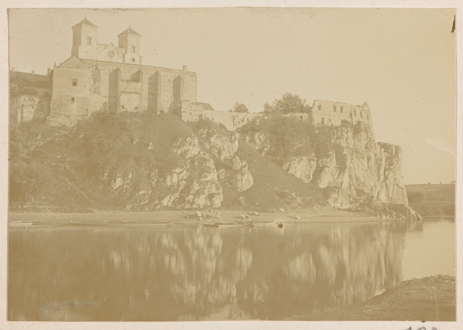 Nazwa: Kraków, Tyniec, opactwo benedyktyńskie, data: 1900-1901, miejsce: , typ obiektu: , wymiary6,0 x 8,6, opis: pejzaż; widok ogólny zespołu klasztornego; wzgórze wapienne; Wisła; prom
