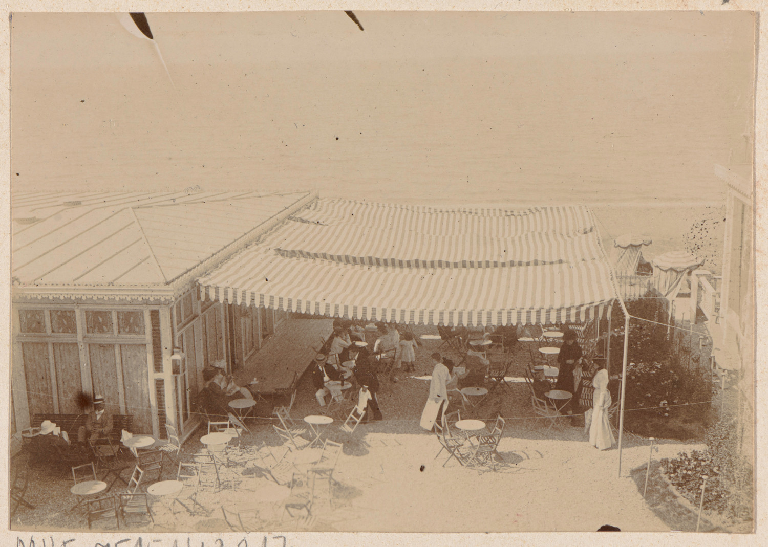 Nazwa: Normandia(?), pawilon - kawiarnia na plaży, data: 1900-1901, miejsce: , typ obiektu: , wymiary6,1 x 8,6, opis: plaża, pawilon, kawiarnia, sztafaż