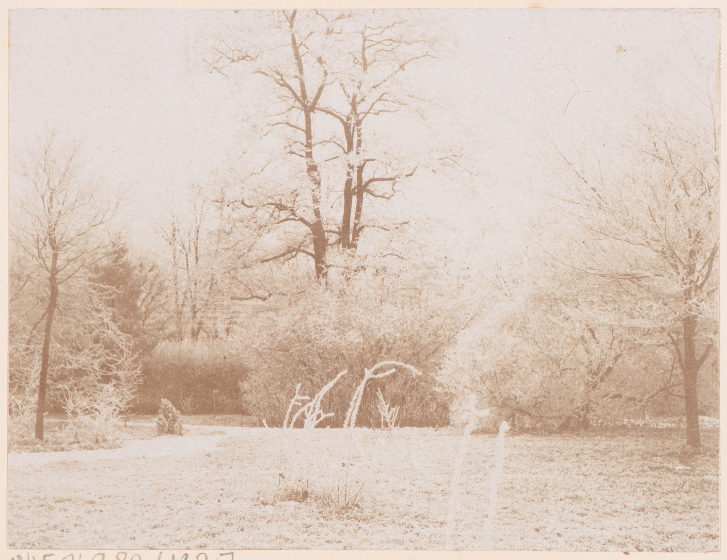Nazwa: Park w zimie, data: 1903, miejsce: , typ obiektu: , wymiary6,4 x 11, opis: Ośnieżone drzewa i krzewy. Na pierwszym pokryty śniegiem trawnik.