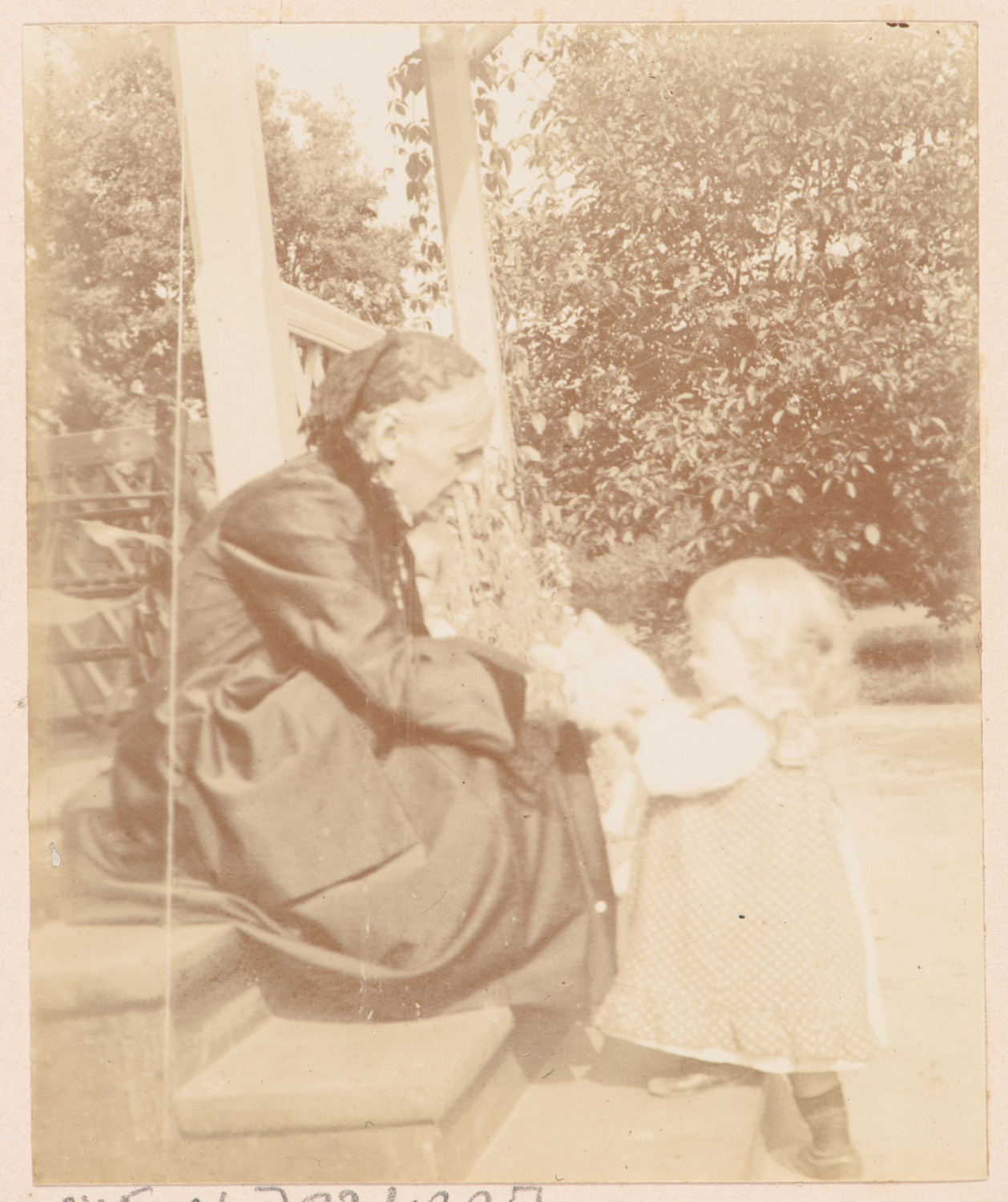 Nazwa: Portret na schodach. Starsza kobieta z dzieckiem, data: 1903, miejsce: , typ obiektu: , wymiary9 x 8,2, opis: Kobieta w wieku ok. 60 lat, siedzi na schodach, przed nią stoi dziecko (ok. 2-3 lata)
