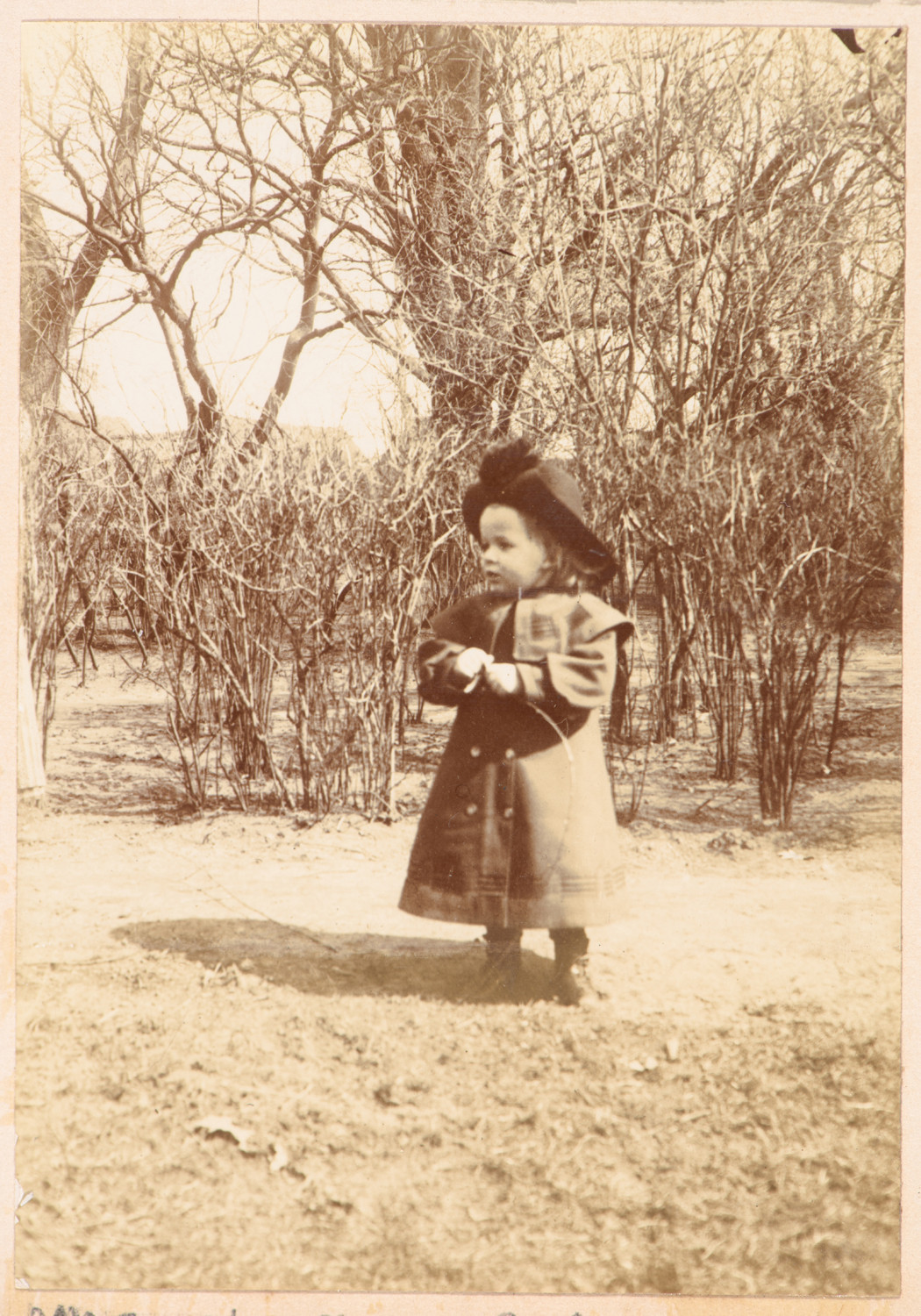 Nazwa: Dziecko, portret w parku., data: 1903, miejsce: , typ obiektu: , wymiary8,3 x 5,8, opis: Małe dziecko stoi na tle bezlistnych drzew i krzewów.