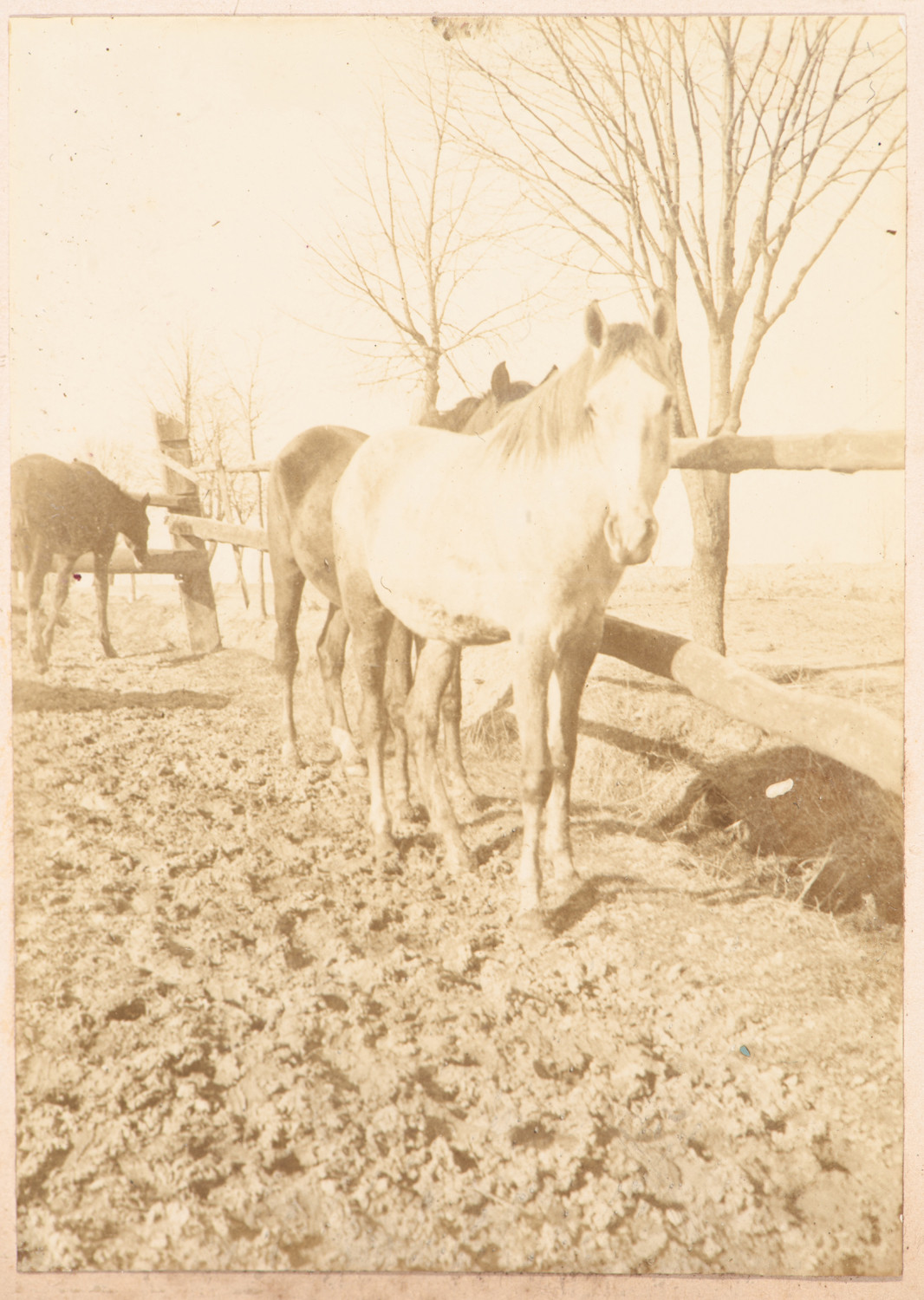 Nazwa: Konie na wybiegu., data: 1903, miejsce: , typ obiektu: , wymiary8,3 x 5,8, opis: Konie (arabskie?) na ogrodzonym wybiegu