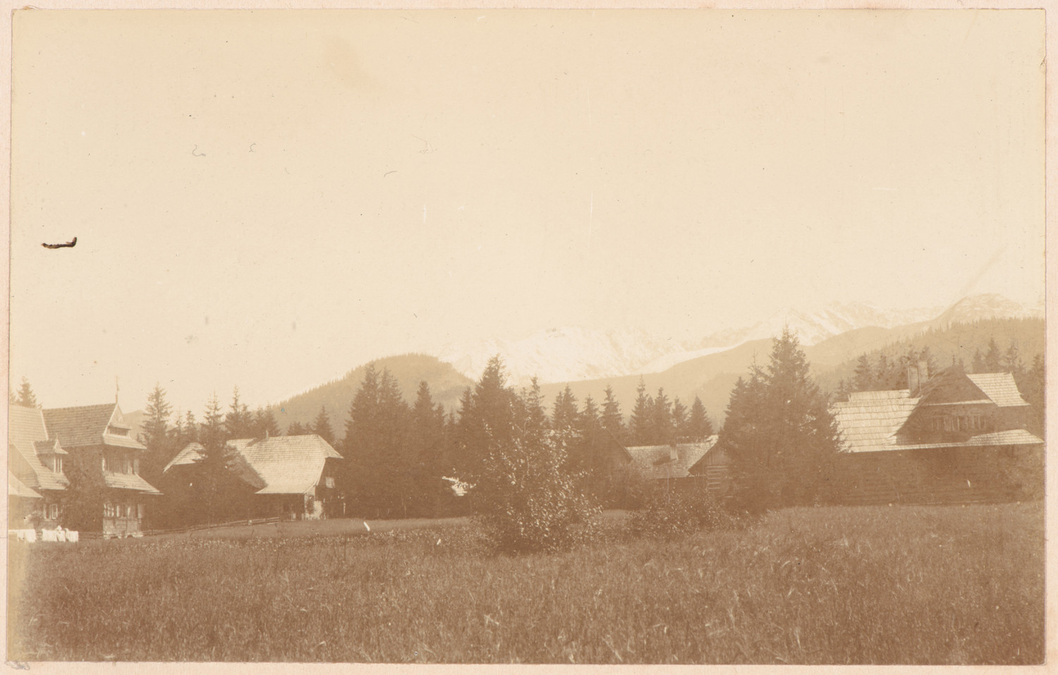 Nazwa: Fragment Zakopanego z panoramą Tatr, data: 1903, miejsce: , typ obiektu: , wymiary7 x 11,4, opis: Na pierwszym planie łąka i drewniane zabudownia. W głębi panorama górska.