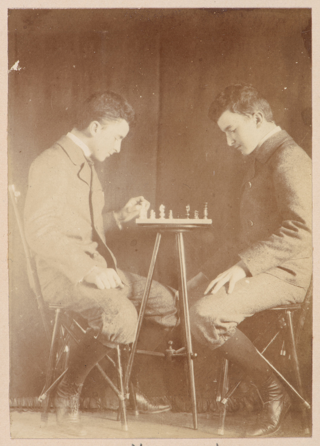 Nazwa: podwójny portret mężczyzny., data: 1903, miejsce: , typ obiektu: , wymiary8,3 x 6,9, opis: Fotografia trickowa, scena przy stoliku, gra w szachy, mężczyzna sfotografowany podwójne, po obu stronach mebla.