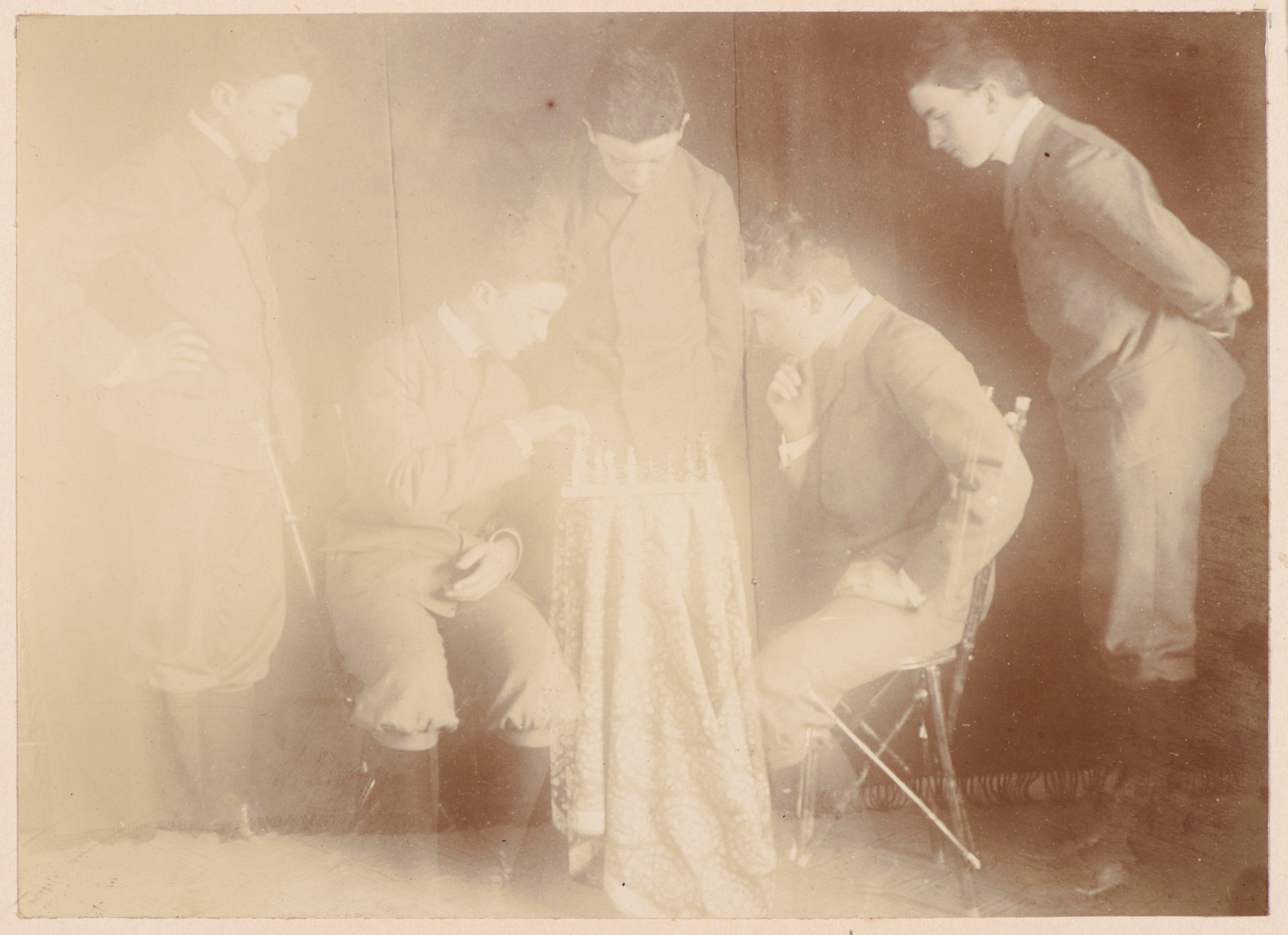 Nazwa: portret wielokrotny mężczyzny., data: 1903, miejsce: , typ obiektu: , wymiary10 x 14, opis: Fotografia trickowa, scena przy stoliku, mężczyzna sfotografowany pięć razy z w różnych pozycjach.