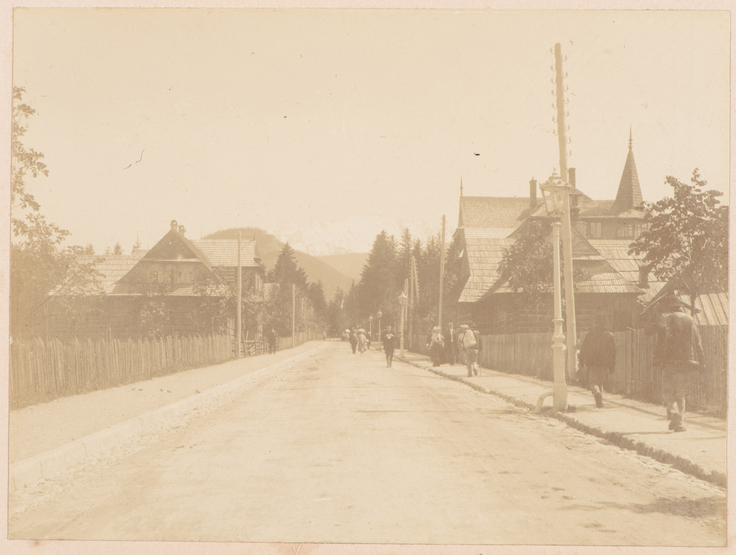 Nazwa: Zakopane , ulica, data: 1903, miejsce: , typ obiektu: , wymiary8,4 x 11,4, opis: Widok w głąb wiejskiej ulicy. Domy i idący chodnikiem ludzie (górale).