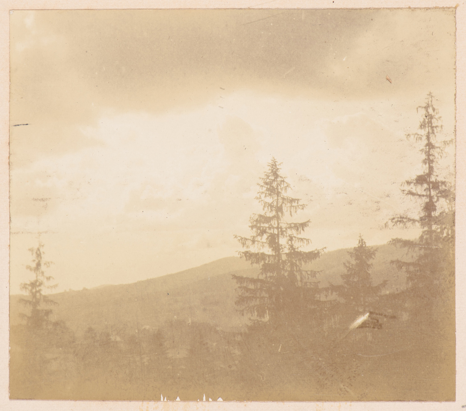 Nazwa: Panorama gór, Zakopane, data: 1903, miejsce: , typ obiektu: , wymiary6,9 x 7,8, opis: Fotografia pejzażowa, pasmo tatrzańskie, chmury, świerki