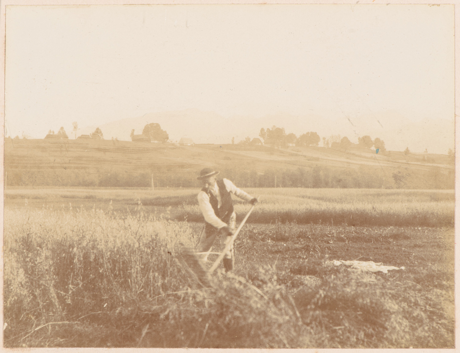 Nazwa: Tatry, żniwa, data: 1903, miejsce: , typ obiektu: , wymiary8,4 x 11,2, opis: Chłop w stroju góralskim ścinający kosą zboże.