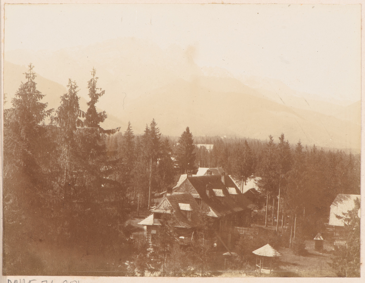 Nazwa: Zakopane z panoramą Tatr, data: 1903, miejsce: , typ obiektu: , wymiary8,5 x 11,2, opis: Widok na drewniane wille pośród drzew. Ujęcie z góry. W tle panorama z Tatr z Giewontem.