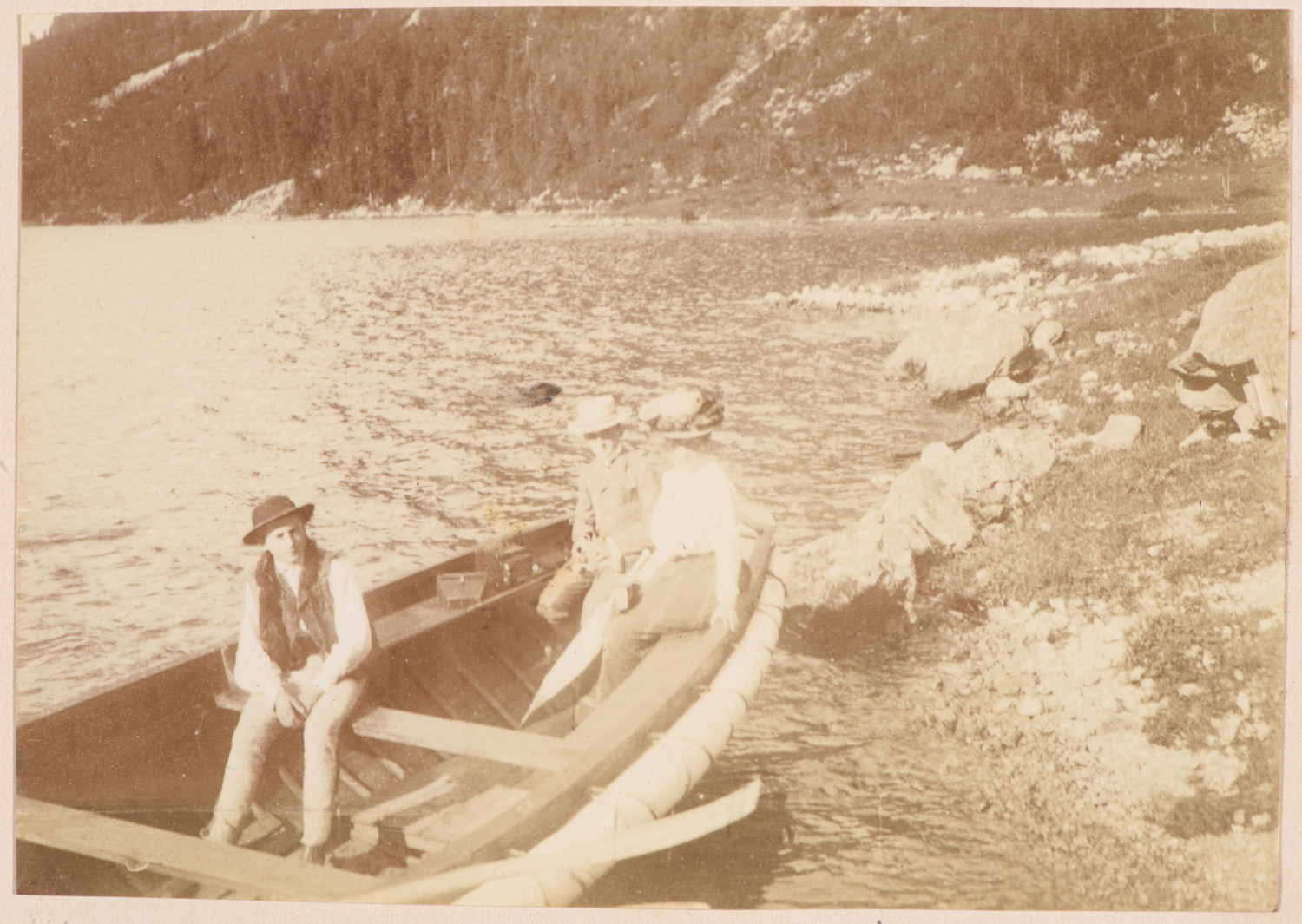 Nazwa: Kobieta i chłopiec, młody góral w drewnianej łodzi., data: 1903, miejsce: , typ obiektu: , wymiary6 x 8,6, opis: Fotografia plenerowa, portret kobiety, chłopca i młodego górala siedzących w łodzi.