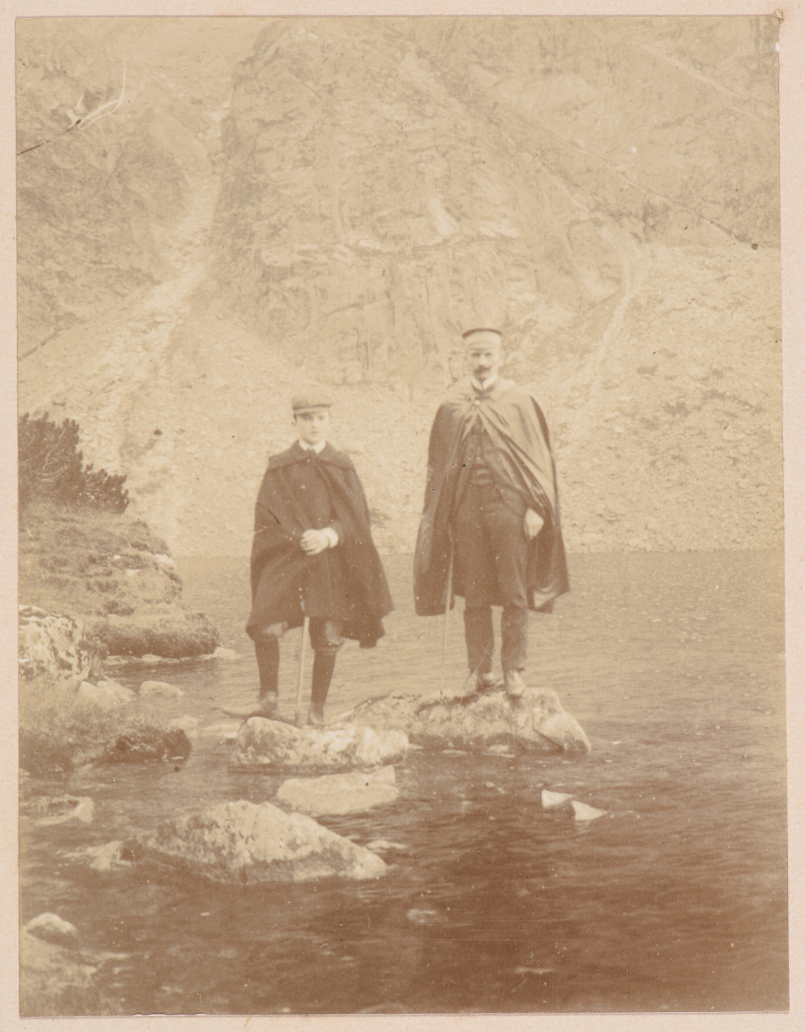 Nazwa: Turyści nad górskim jeziorem, Tatry, data: 1903, miejsce: , typ obiektu: , wymiary7,6 x 5,9, opis: Fotografia plenerowa, turystyczna, nad jeziorem
