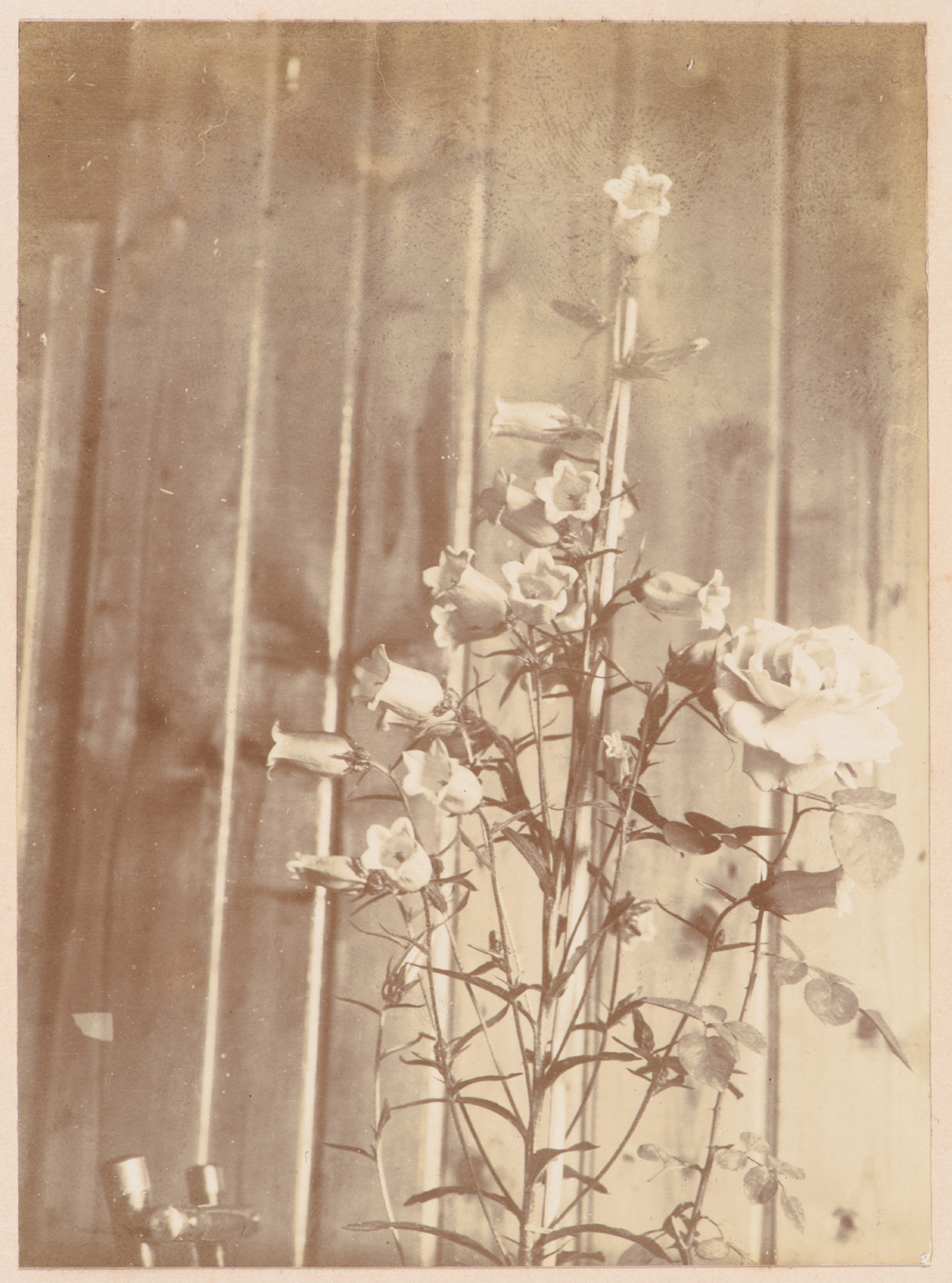 Nazwa: Kwiaty - dzwonek ogrodowy i róża, data: 1903, miejsce: , typ obiektu: , wymiary10,6 x 7,8, opis: Gałązki kwiatów (dzwonek i róża) na tle drewnianej ściany