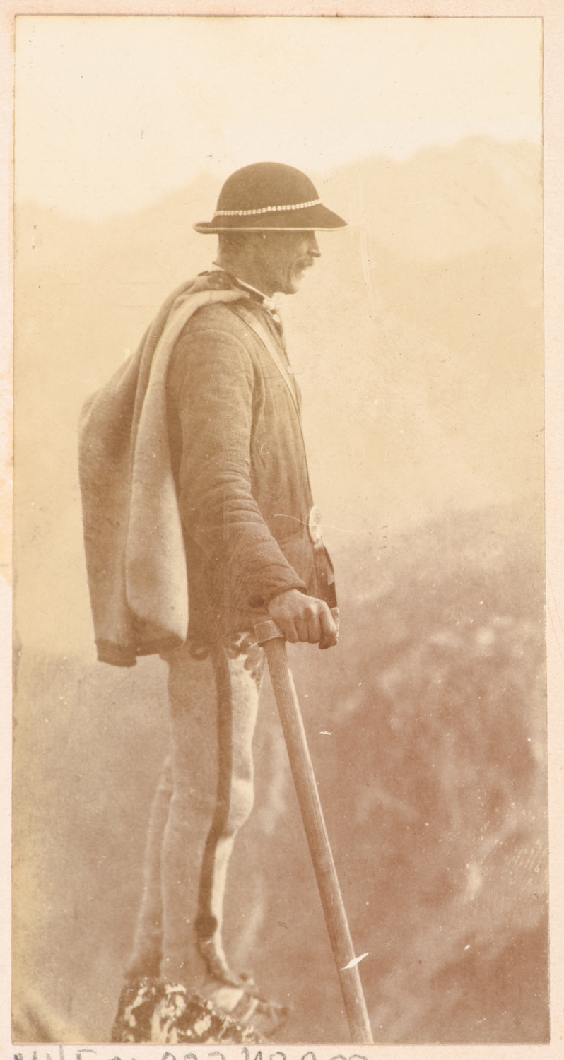 Nazwa: Góral na tle panoramy Tatr, data: 1903, miejsce: , typ obiektu: , wymiary8,8 x 4,5, opis: Mężczyzna w stroju góralskim, portret na tle rozległej górskiej panoramy.