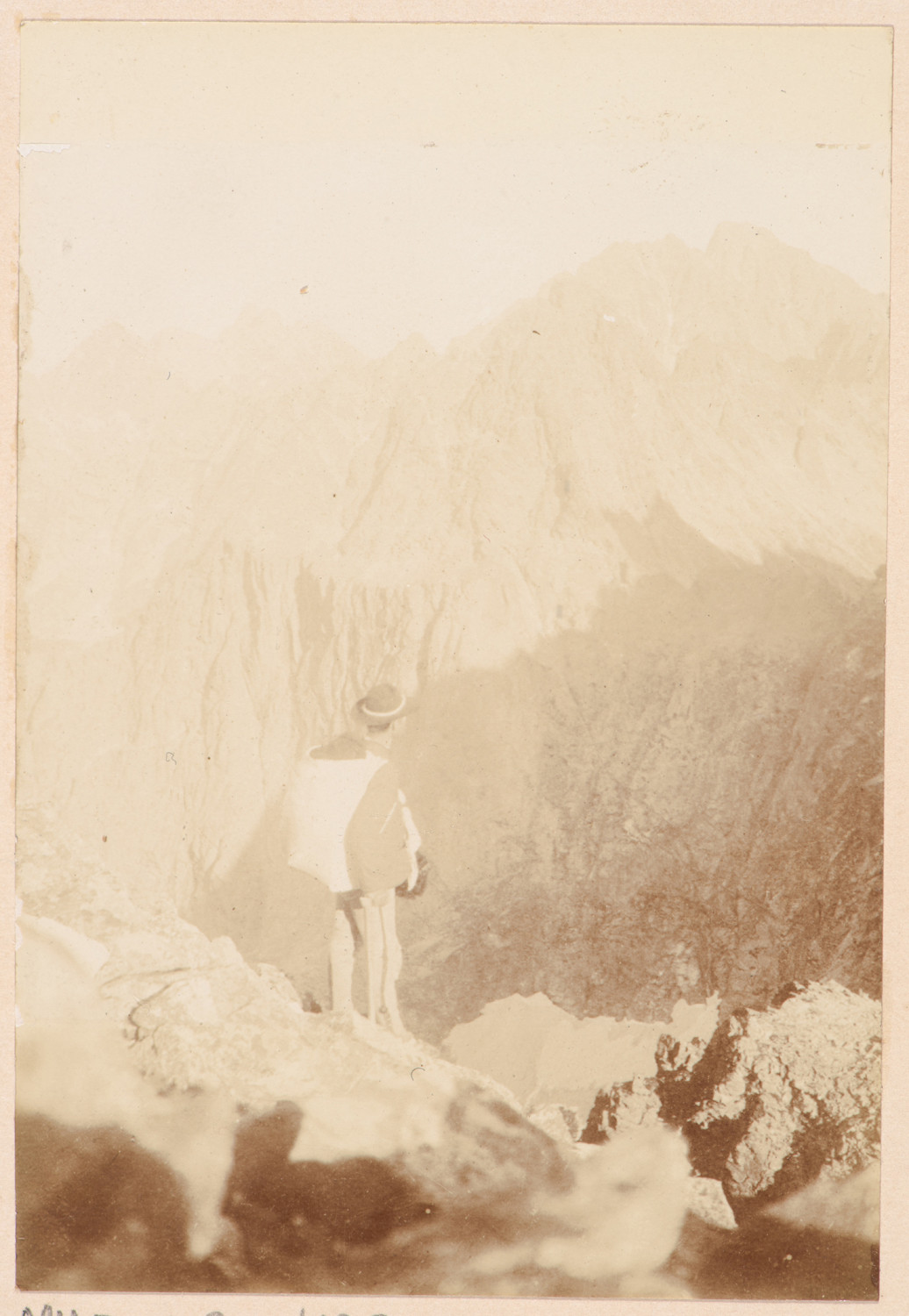 Nazwa: Góral na tle panoramy Tatr, data: 1903, miejsce: , typ obiektu: , wymiary8,5 x 5,8, opis: Mężczyzna w stroju góralskim, portret, ujęcie z góry na tle rozległej górskiej panoramy.