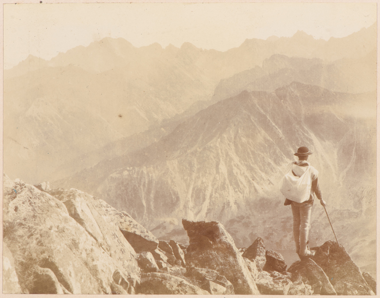 Nazwa: Góral na tle panoramy Tatr Wysokich, data: 1903, miejsce: , typ obiektu: , wymiary8,7 x 11, opis: Ujęcie z górskiego szczytu. Góral, portret na tle rozległej górskiej panoramy.