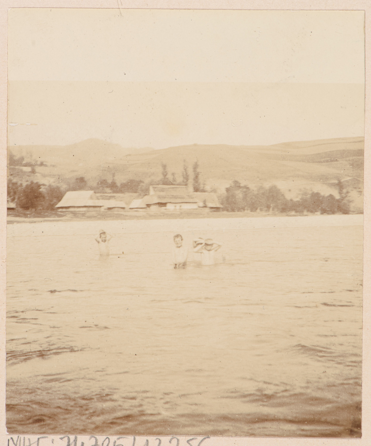 Nazwa: Kąpiel w rzece., data: 1903, miejsce: , typ obiektu: , wymiary7 x 5,9, opis: Dzieci kąpiace sie w rzece. W tle wieś i góry.
