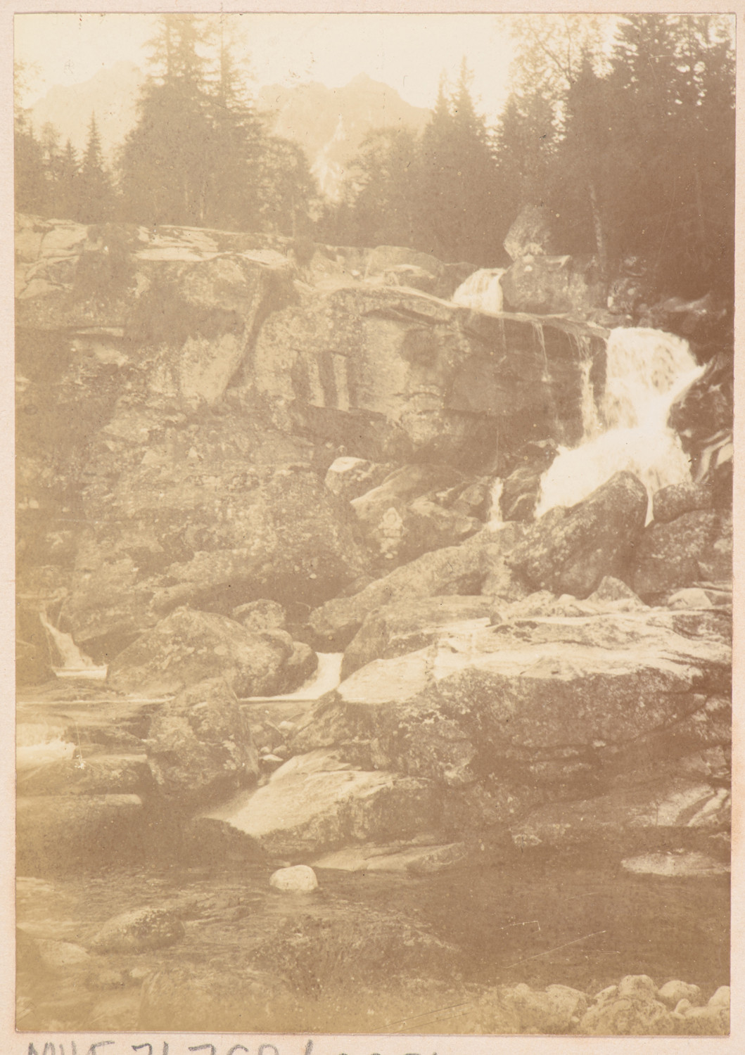 Nazwa: wodospad w Tatrach, data: 1903, miejsce: , typ obiektu: , wymiary8,3 x 5,9, opis: Góry, wodospad. Ujęcie z dołu.