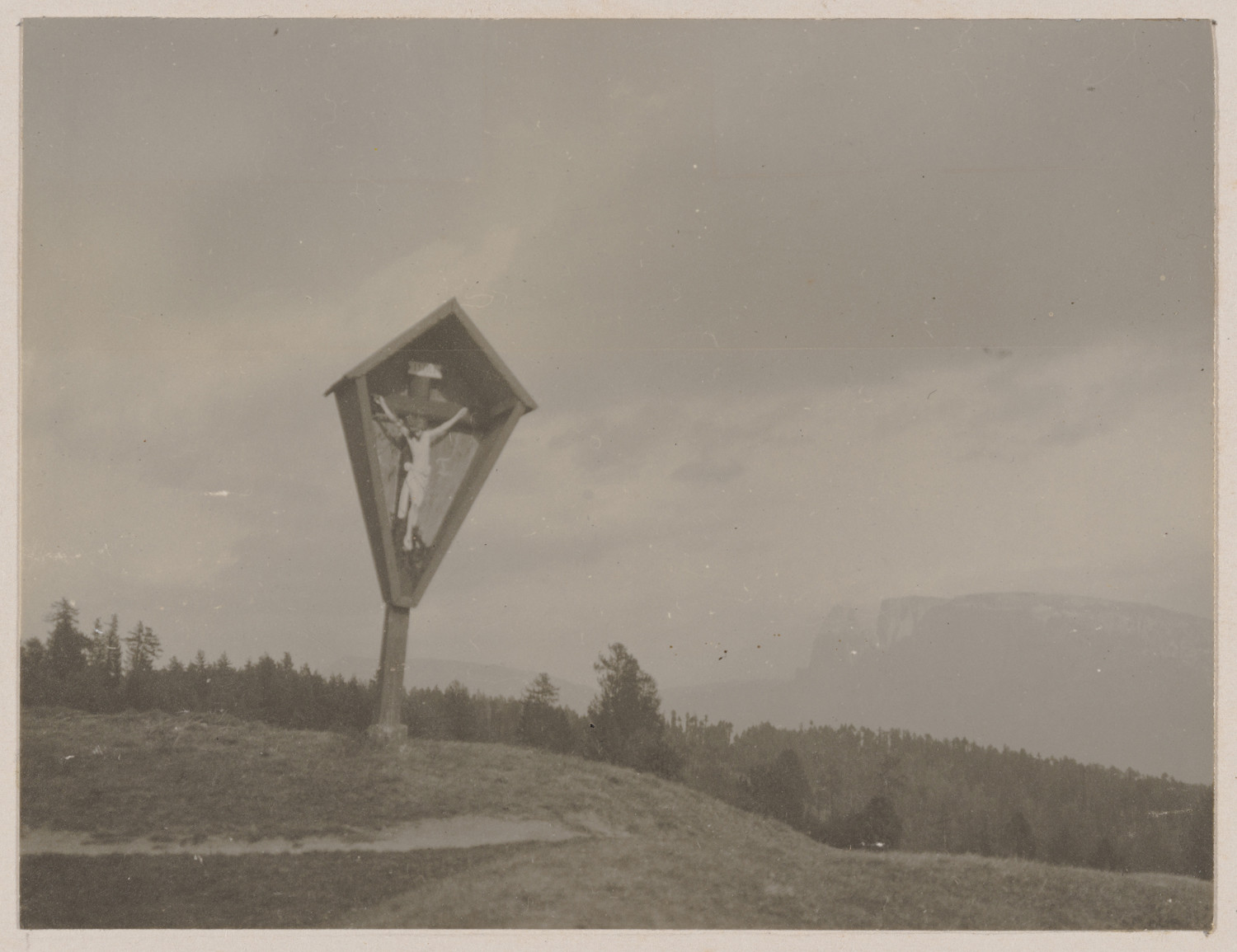 Nazwa: Widok na fragment połoniny alpejskiej, drewniany krzyż z jasną figurką Chrystusa Ukrzyżowanego., data: 1911, miejsce: , typ obiektu: , wymiary7,3 x 9,6, opis: Fragment łańcucha górskiego, na jego tle drewniany krzyż z figurką Jezusa Ukrzyżowanego.