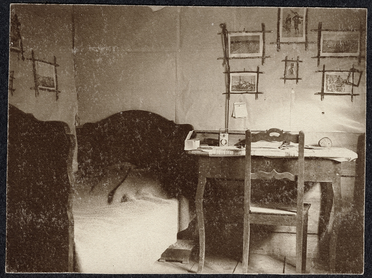 Nazwa: pokój wojskowego, wnętrze, fot. z albumu zw. temat. z frontem ros. w cz.I wojny świat., data: ok. 1915, miejsce: , typ obiektu: , wymiary10,5 x 8,0, opis: wnętrze pokoju oficera, meble stół z przedmiotami jak aparat fotograficzny, na ścianach oprawione fotografie.