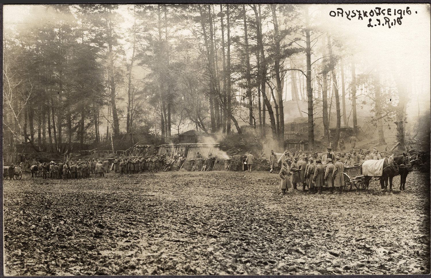 Nazwa: Onyszkowce, obóz wojskowy, data: 1916, miejsce: , typ obiektu: , wymiary13,8 x 8,8, opis: kilku żołnierzy austriackich stojących prze kuchni polowej, kilkudziesięciu innych na skraju lasu