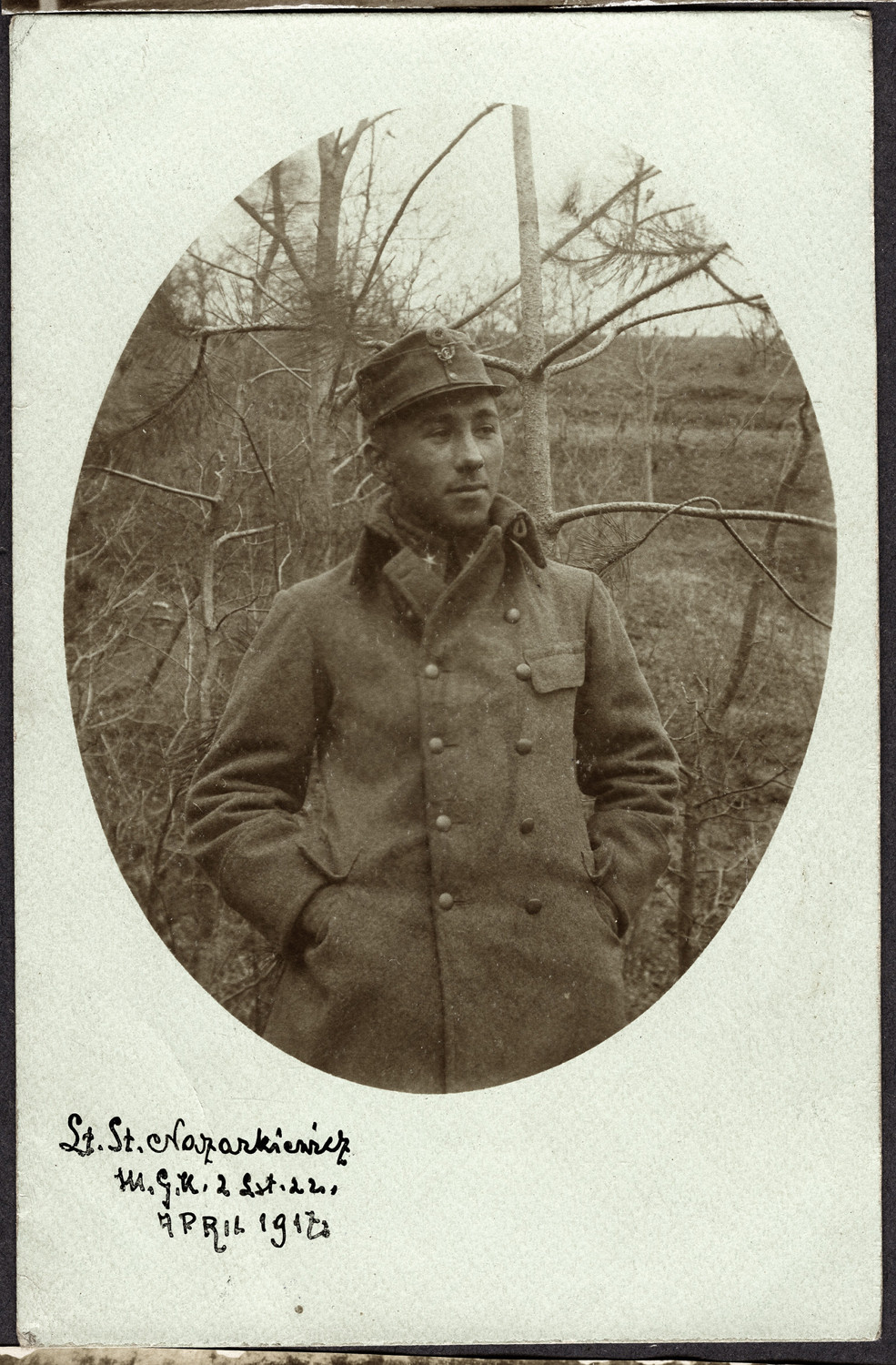 Nazwa: Stanisław Nazarkiewicz, portret, data: 1917, miejsce: , typ obiektu: , wymiary9 x 13,8, opis: Młody mężczyzna w półpostaci, ubrany w mundur i czapkę wojskową pozuje do fot.